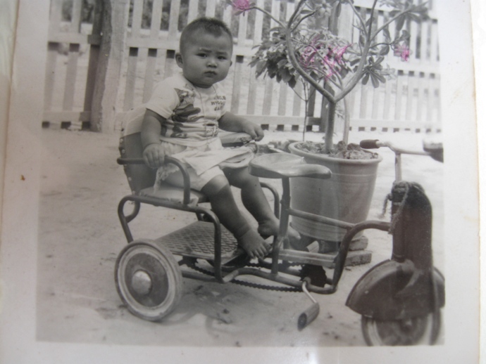 เด็กคนที่ใส่เสื้อสีขาวและสวมหมวกคือผมเองครับ อายุประมาณ 3 ขวบกว่า ๆ ครับ
