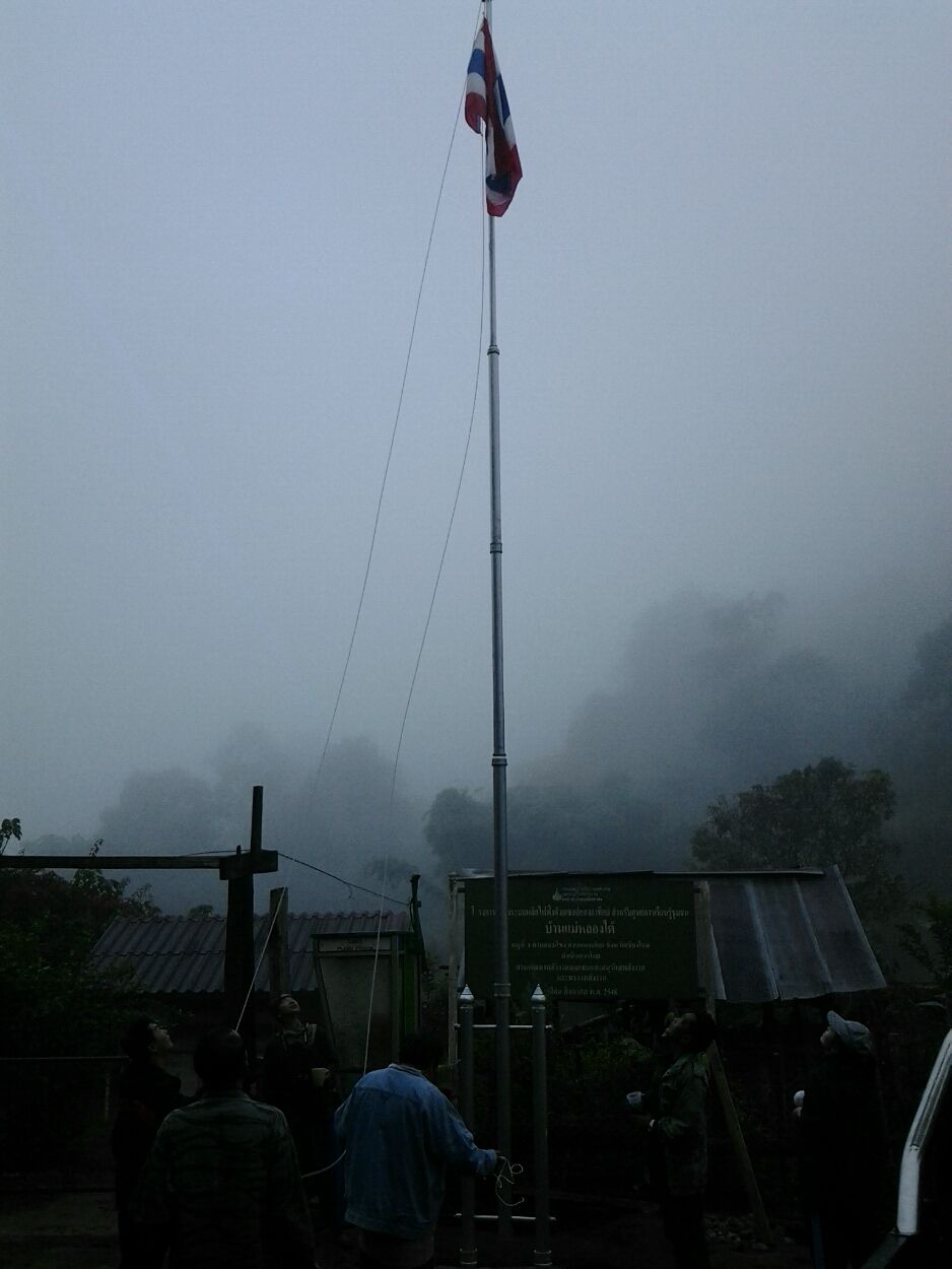 เนื่องจากไม่ได้นอนมาสองคืนพอตื่นมาทุกคนก็มาพร้อมกับเสาธงที่ลงฐานเรียบร้อยลอปูนแห้งครับ