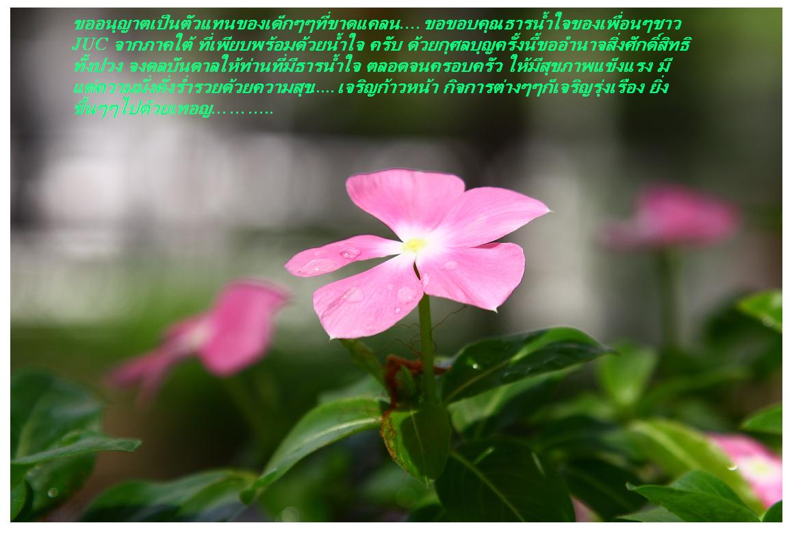ขออนุญาตเป็นตัวแทนของเด็กๆๆที่ขาดแคลน….ขอขอบคุณธารน้ำใจของเพื่อนๆชาว JUC จากภาคใต้ ............ที่เพียบพร้อมด้วยน้ำใจ ครับ ด้วยกุศลบุญครั้งนี้ขออำนาจสิ่งศักดิ์สิทธิทั้งปวง จงดลบันดาลให้ท่านเพื่อนพ้องน้องพี่ ภาคใต้ ที่มีธารน้ำใจ ตลอดจนครอบครัว ให้มีสุขภาพแข็งแรง มีแต่ความมั่งคั่งร่ำรวยด้วยความสุข.....เจริญก้าวหน้า กิจการต่างๆๆก็เจริญรุ่งเรือง ยิ่งขึ้นๆๆไปด้วยเทอญ………..