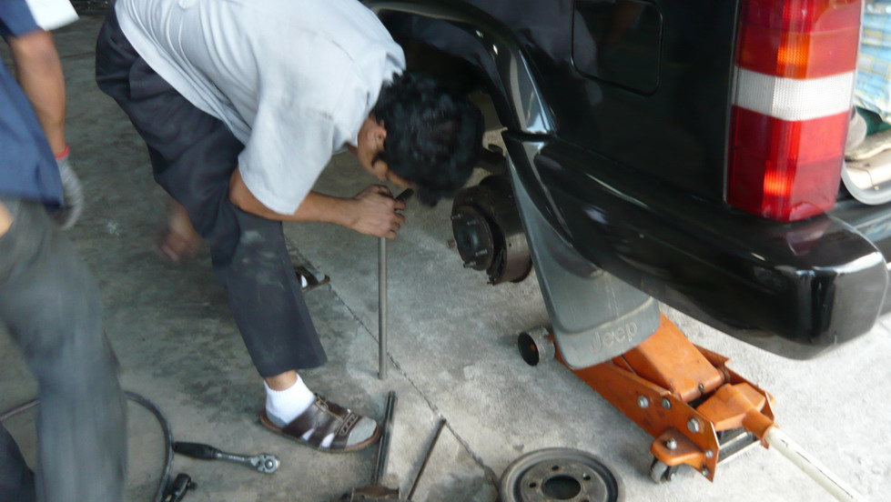 เมื่อเสาร์-อาทิตย์ที่ผ่านมา ผมได้ไปทำบุญที่จันทบุรี แล้วได้เข้าไปพักที่โรงแรมกึ่ง รีสอร์ท แห่งหนึ่งในตัวเมืองจันท ก่อนเข้าที่พักก็ได้แวะปั๊ม เติมลมยาง เช็คยาง เพื่อเตรียมออกไปทำบุญแต่เช้า เพราะปั๊มอยู่เยี้องๆ กับที่พัก แล้วก็เช็คอินเข้าพักเรียบร้อย พอตื่นเช้าขึ้นมา ก็มุดไปใต้ท้องรถเพื่อปรับโช๊คหลัง เพราะรู้สึกเมื่อวานมันแข็งไปนิดหนึ่ง ก็สังเกตุเห็นใต้คานล้อหลัง มีร่องรอย ที่พื้นคล้ายๆร่อยครูด แล้วก็มีเศษอิฐที่พื้น 2 จุด ก็ไม่ได้สนใจอะไร เพราะที่นี้ ที่จอดรถ เป็นสัดส่วน มีทั้งยาม ทั้งไฟส่องสว่าง และอยู่ห่างจากประตูที่พักไม่น่าเกิน 20 เมตร ปรับโช๊ค เสร็จขับออกมาจากที่พัก วิ่งออกมาได้ประมาณ กิโลหนึ่ง รถสะบัดอย่างรุนแรง ย้วยไปย้วยมา มองในกระจกเห็นล้อหลังส่ายไปมา รีบจอดข้างทางไปดู ตกใจหมด ล้อทั้งทั้งคู่ แบะออก เกือบหลุด นี่ผมวิ่งออกไปอีก 5 เมตร รถลงไปกองกับพี้นแนะนอน ปรากฎว่าล้อหลังทั้งคู่ โดยคลายน๊อตออกทั้งหมดแค่เอานิ้วสะกิด น็อตตัวเมียก็หลุดออกหมดแล้ว มีน็อตตัวเมียหายไป 2 ตัว ไม่รู้หล่นหายหรือโดยขโมยไป น๊อตตัวผู้ (สตัท) หักไปตัวหนึ่ง ถอดล้อออกมาดูแม็กโดนน็อตตัวผู้คว้านซะรูกว้างเลย เสียของหมด ก็เลยไปเอาน็อตตัวเมียจากล้อหน้า มาไขให้แน่นก่อน ประคองรถวิ่งไปทำบุญก่อน ค่อยว่ากันอีกที
