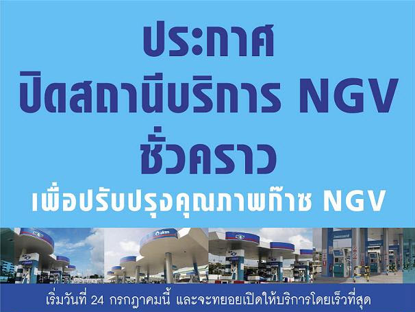 ปตท.จะปิดให้บริการสถานีบริการก๊าซธรรมชาติในรถยนต์ (เอ็นจีวี) จำนวน 38 แห่ง ตามแนวท่อฝั่งตะวันออก เช่น ใน จ.ชลบุรี ระยอง กทม. ปทุมธานี และสระบุรี เป็นการชั่วคราว ตั้งแต่วันที่ 24 ก.ค.นี้ เนื่องจากเกิดปัญหาการจัดส่งอุปกรณ์ปรับปรุงคุณภาพจากต่างประเทศ มีความล่าช้า คาดว่าจะสามารถทยอยเปิดให้บริการได้ทั้งหมด ภายในเดือน ต.ค. โดยในเบื้องต้น ปตท.วางแนวทางแก้ไขปัญหา โดยปรับปรุงในส่วนของสถานีแม่ให้รับก๊าซได้มากขึ้น และส่งไปยังสถานีลูกได้เร็วขึ้น โดยการดำเนินงานดังกล่าว เพื่อรองรับแผนปรับปรุงคุณภาพสถานีบริการเอ็นจีวี ซึ่งปัจจุบันยอดใช้เอ็นจีวี มีประมาณ 5 พันตันต่อวัน มีปั๊มเอ็นจีวี 408 แห่ง โดยตั้งเป้าเพิ่มขึ้นเป็น 460 แห่งในปลายปี 2553