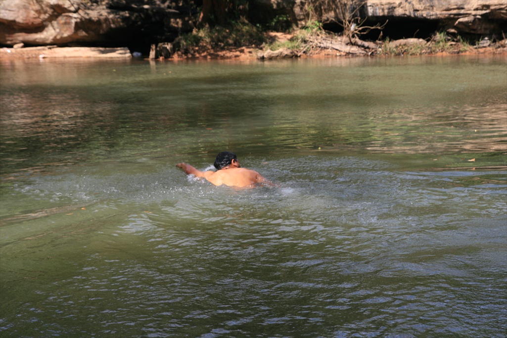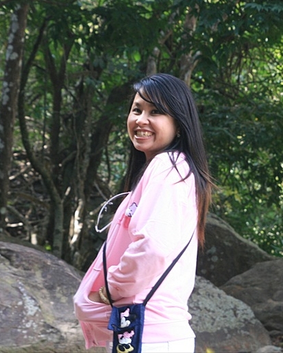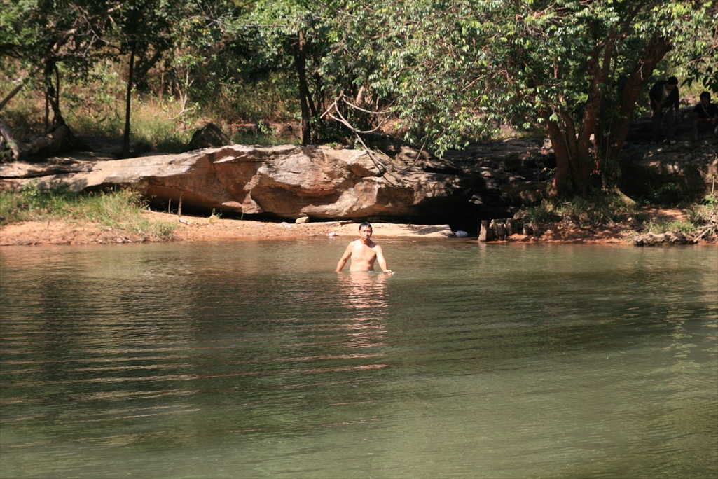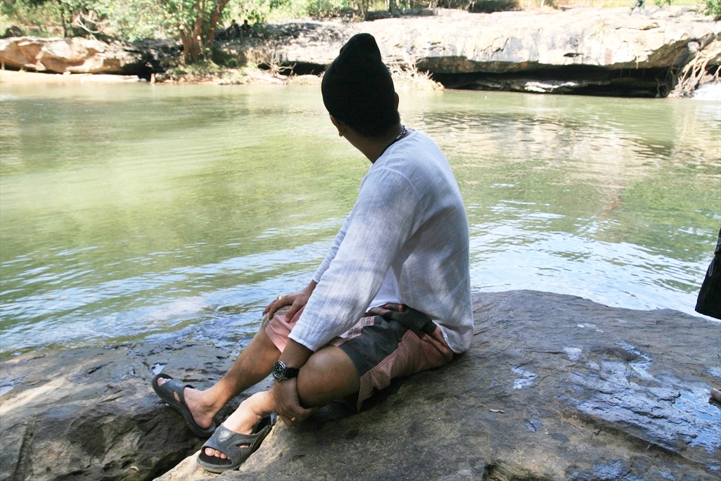 นั่งบนโขดหินริมน้ำตกสบายเชียวน้า