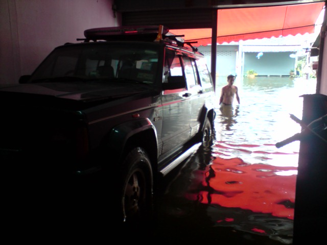 ใช่ค่ะ น้ำหน้าหมู่บ้านถึงประมาณเอวเลยเอารถออกไม่ได้ เลยพยายามหาวิธีอยู่น่ะค่ะ