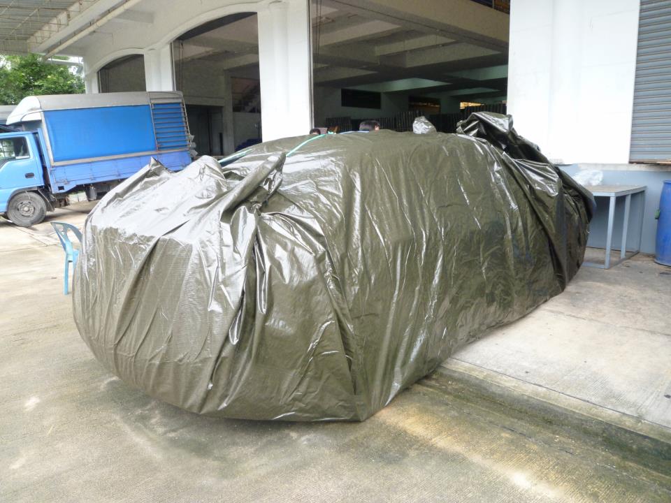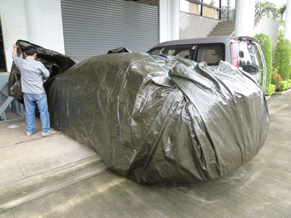 ผ้าใบห่อกันน้ำเข้ารถครับ ถ้าท่วมสูงเกือบมิดรถ น่าจะวางบนสแตนท์สี่ขาน่าจะเพิ่มความสูงได้อีก เห็นมีลงในเฟสบุ๊คเลยมาลงให้ดูกัน ขายประมาณ 1,000กว่าบาท