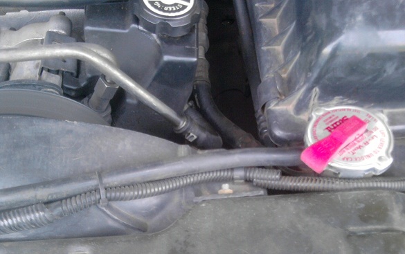 - ขับรถ แล้วหาที่จอด ดับเครื่องเสร็จ...เดินมาดูหน้ารถปรากฎว่า มีน้ำหล่อเย็นไหลอยู่บนพื้นที่จอดรถ ด้านหน้าล้อซ้ายครับ (ลองสังเกตุดูบริเวณทางเข้าก่อนที่จะจอดก็จะเห็นรอยหยดไม่เยอะครับ)