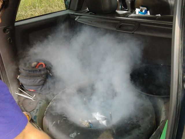 ในอาทิตย์ก่อนโน้น เนื่องด้วยปัญหาอะไรไม่ทราบได้ หลังจากเติมแก๊สเต็มถังในปั๊มแล้ว ได้ยินเหมือนใครปล่อยลมยางรถ เดินมารอบรถจนทั่ว จนเริ่มได้กลิ่นแก๊สด้านหลังรถ เลยเปิดประตูหลังดู ชัดเลยครับ