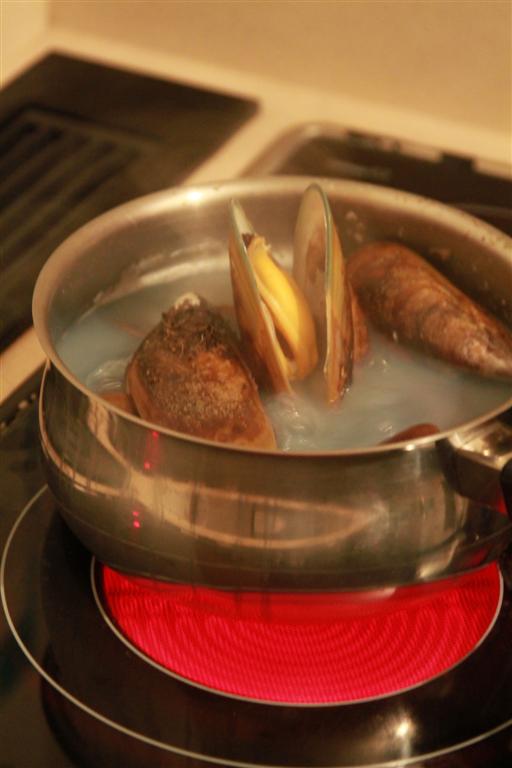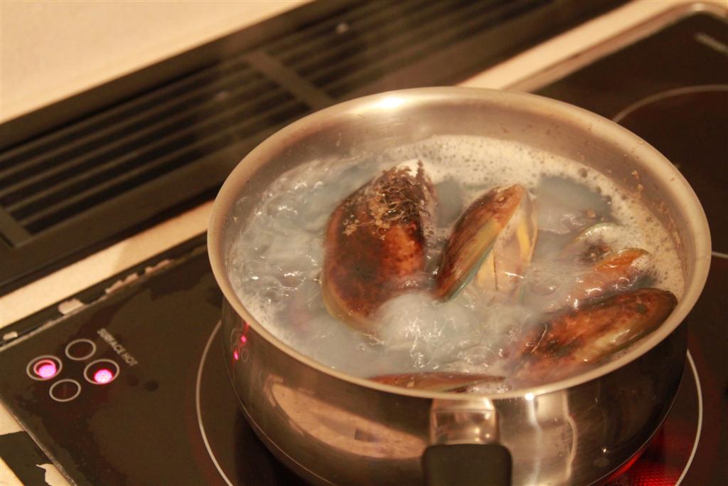 Pour 1 or 2 cups of black wine or water into a large saucepan, add the mussels and cover the pan. Remember that not a lot of liquid is needed.