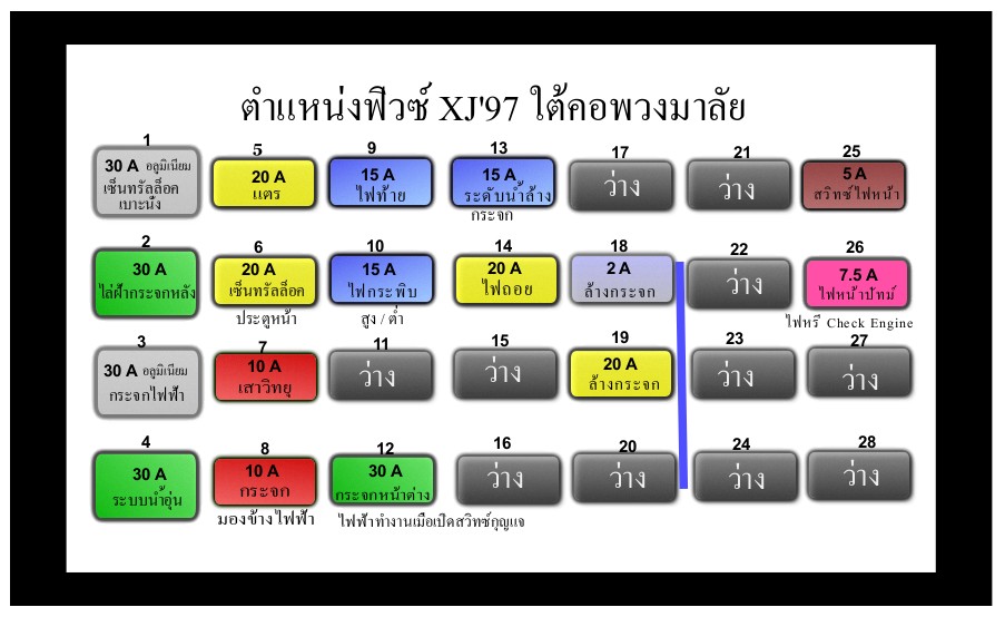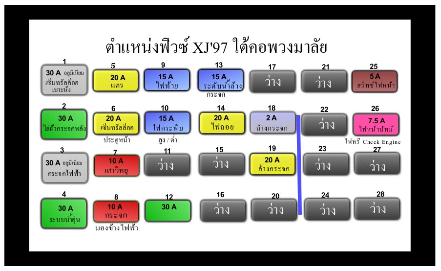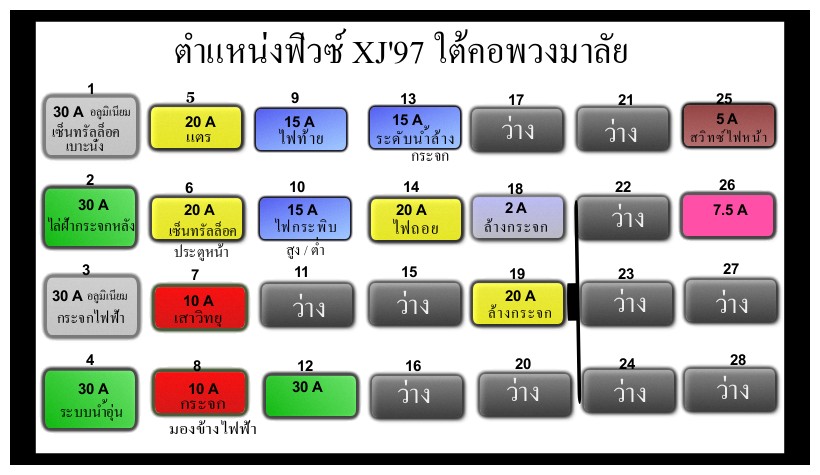 รบกวนถาม บรรดาท่านอาจารย์ และเพื่อนๆ ตำแหน่งฟิวซ์ ใต้คอพวงมาลัย XJ 97 ในคู่มือดูแล้วไม่ตรงอยู่หลายจุดครับ ที่ยังไม่รู้คือตำแหน่งที่ 12 และ 26 เนื่องจากระบบสวิทซ์เซ็นทรัลล็อค เสียจะถอดมาไล่รื้อระบบไฟ ขอบพระคุณครับ