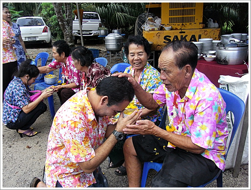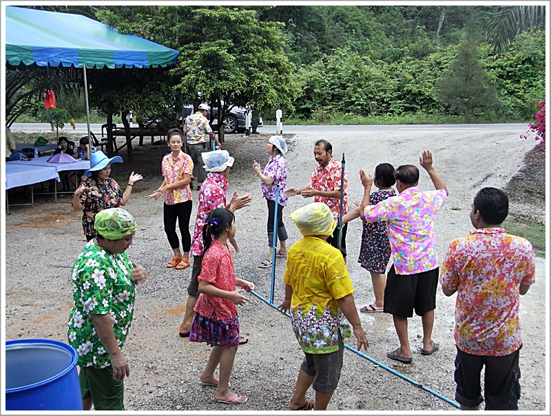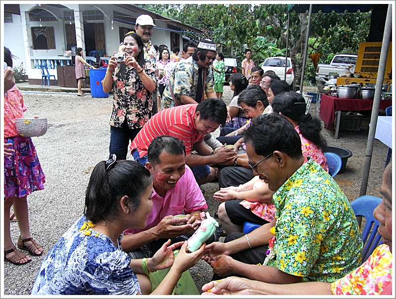 ในวันขนทรายนี้ จะมีการเล่นรดน้ำกันและเป็นการเล่นอย่างสนุกสนานที่สุดวันหนึ่ง ผู้หญิงจะแต่งกายพื้นเมืองจะนุ่งผ้าซิ่นสวมเสื้อแขนยาวทัดดอกเอื้องที่มวยผม ส่วนผู้ชายจะแต่งกายด้วยเสื้อผ้าชุดพื้นเมืองคล้องคอด้วยดอกมะลิ ถือขันหรือโอคนละใบใส่น้ำเพื่อรดกันอย่างสนุกสนาน และขนทรายเข้าวัดด้วยใบหน้ายิ้มแย้มแจ่มใสทุก ๆ คน