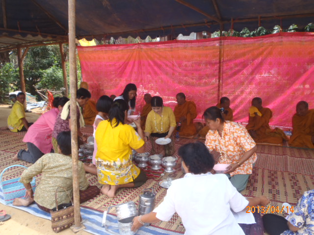 วันนี้ตั้งแต่เช้าตรู่ชาวบ้านจะจัดอาหารหวานคาวใส่สำรับไปถวายพระที่วัด เป็นการถวายภัตตาหารหรือที่เรียกกันว่า ทานขันข้าว เป็นการถวายทานเพื่ออุทิศส่วนกุศลถึงญาติพี่น้องบิดามารดาที่ล่วงลับไปแล้วอีกด้วย รวมทั้งถวายเจดีย์ทราย ถวายจ่อตุง ถือว่าเป็นอานิสงส์