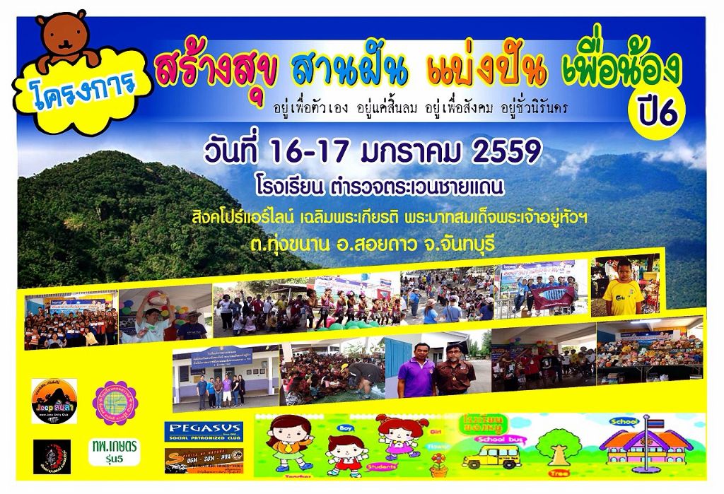 สวัสดีครับ พี่น้องชาว JUC ทุกๆท่าน ผมนายอรรณพ หิรัญวงศ์ 1 ในสมาชิก JUC ขอประชาสัมพันธ์ กิจกรรมที่จะจัดความสนุกสนาน ในวาระวันเด็กแห่งชาติ ปี 2559 โดยไปออกไปสำรวจ โรงเรียนตามคำแนะนำจากหลายที่หลายท่านในทีม PEGASUS และวันนี้พวกเราได้ออกไป พบกับ โรงเรียน และเสนองานการจะมาขอทำกิจกรรมให้กับเด็กๆ ได้แล้วคือ โรงเรียน ตำรวจตะเวณชายแดนฯ ต.ทุ่งขนาน อ.สอยดาว จ.จันทบุรี