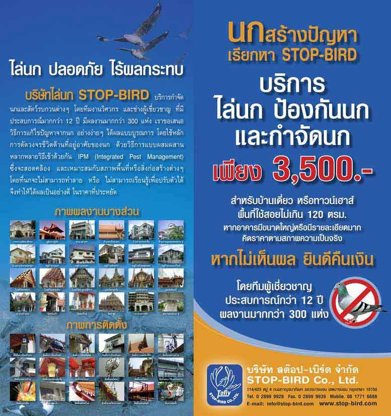 เนื่องจากที่ทำงาน มีนกพิราบ นกกระจอก นกแอ่นลม มาเกาะอยู่ตามหลังคา ขื่อ อาคารจำนวนมาก ขอย้ำว่า จำนวนมาก แล้วถ่ายมูลออกมา สกปรกมาก อยากจะไล่นก เปิดดูตามที่ โฆษณา มี่ทั้งแบบเป็น เจล ทาตามจุดที่นกเกาะ แบบ คลื่นเสียงไล่นก แบบ โซ่ ฝังคลื่นแม่เหล็กไฟฟ้า