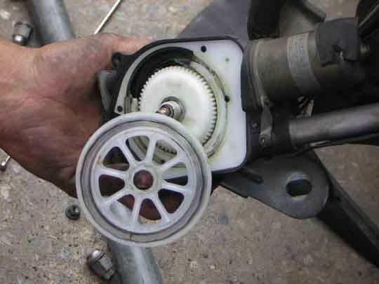 4. เปิดฝาชุดมอเตอร์ดู จะเห็นว่ามี สายเฟือง หักคาอยู่ในตัวมอเตอร์ อันนี้ต้องเอาออกนะครับ