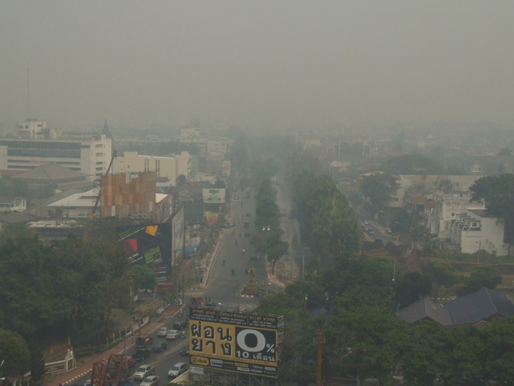 มองไปยังในคูเมือง..ขึ้นไปยืนถ่ายบนชั้นดาดฟ้ายังรู้สึกแสบตา..ใครมีปัญหาด้านสุขภาพควรงดเดินทางไปเชียงใหม่ช่วงนี้นะครับ..
