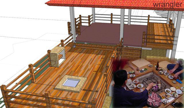 ขออนุญาตครับ ความเห็นของผมว่ามันน่าจะอยู่บริเวณมุมไดมุมหนึ่ง เพื่อให้ได้เนื้อที่ใช้สอยให้เยอะที่สุดแล้วเป็นเตาก่อ สูงขึ้นมา เพราะในความเป็นจริง เราคงไม่ได้มานั่งล้อมวงรอบกองไฟกันตลอดเวลา อากาศมันร้อน + ควัน และท่าจะต้องนั่ง ขัดสมาด ส ว ทั่งหลายลุกนั่งลำบากครับ.....ขอบคุณครับ