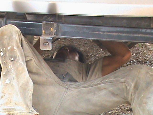 1.ถอดแผ่นเหล้กกันกระแทกถังน้ำมันออกก่อนครับ(มันอาจจะติดขากันชน ขาเหล็กยางอะไหล่มากหน่อย)