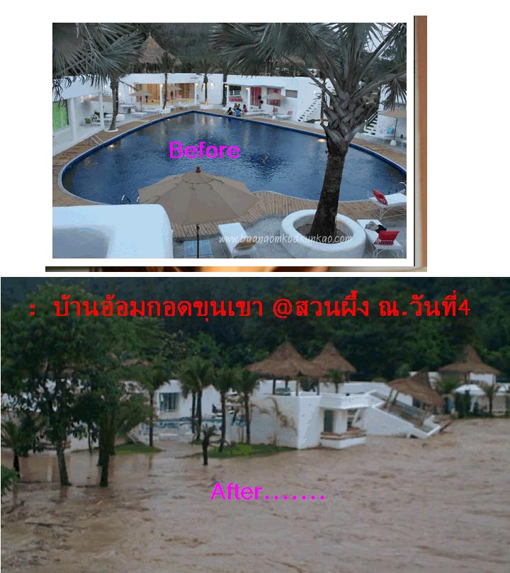 วิกฤตน้ำท่วมสวนผึ้ง ครั้งนี้กระทบแหม่มอย่างหลีกเลี่ยงไม่ได้ น้ำป่าจากเทือกเขาตะนาวศรีได้ไหลทะลักเข้าสู่ลำภาชี แม่น้ำสายหลักของสวนผึ้ง เส้นทางคมนาคมส่วนใหญ่ตั้งแต่บ้านพุระกำมาจนถึง บ้านบ่อหวี ขาดการติดต่อจากคนภายนอก (ข่าวช่อง 3) ฝนได้ตกลงมาอย่างไม่ขาดสายตั้งแต่วันที่ 1 ถึงวันนี้ฝนยังไม่มีทีท่าว่าจะหยุดตก ความเสียหายของแหม่มครั้งนี้กระท่อมริมน้ำที่ปลูกไว้ น้ำได้เอ่อเข้าบ้าน ถ้าฝนไม่หยุดตกวันนี้คาดว่าจะมิดหลังคา ลานกางเต็นท์ริมน้ำที่กลุ่มนกขมิ้นเคยมากาง ได้ท่วมลานนี้สูงกว่า 3 เมตร ต้นมะพร้าวที่ปลูกคาดว่าจะเสียหายทั้งหมด ความเสียหายของแหม่มยังไม่ได้ครึ่งของพี่น้องที่อยู่ช่วงบน ลองมาดูสภาพน้ำที่ไหลผ่านหน้าบ้าน