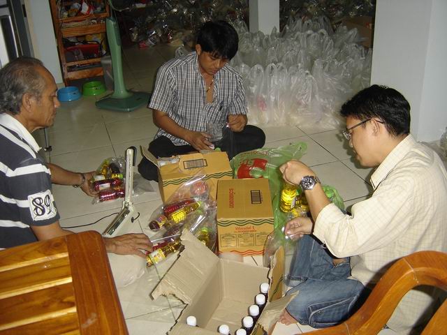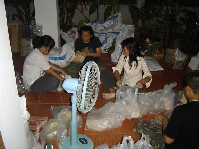 ช่วยกันลำเลียงของลงจากรถทุกคัน เพื่อมอบให้กับผู้ประสบภัยน้ำท่วม โดยแยกเป็นหมู่บ้านกระจายกันไป