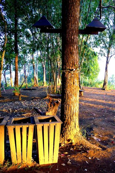 ณ. ที่ทำการฯ ทองผาภูมิ แสงสีทองยามเช้า สาดเข้าหาเต็นท์และต้นไม้ทั่วบริเวณ...