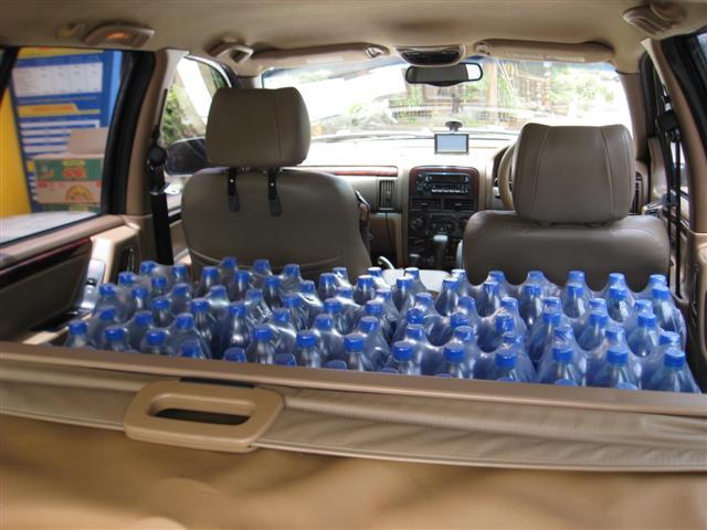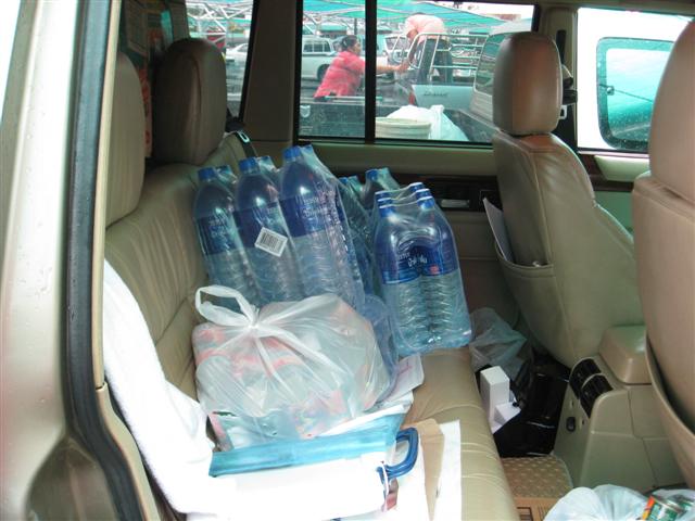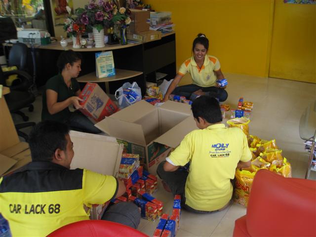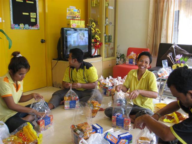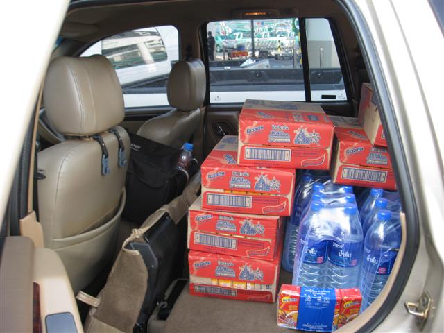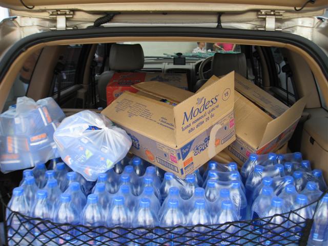 โดยการแจกของครั้งนี้ ในถุงนั้นประกอบด้วย โอวัลติลUHT 4 กล่อง,มาม่าหมูสับ 5 ห่อ ,น้ำ1.5ลิตร ,ยาแก้ปวด ,ปลากระป๋อง 3 ป๋อง ,ผ้าอนมัย 1 ห่อ
