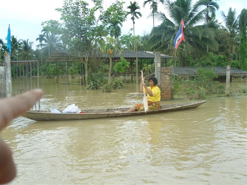 ระหว่างทาง...มีชาวบ้านพายเรือมารับของบริจาค...