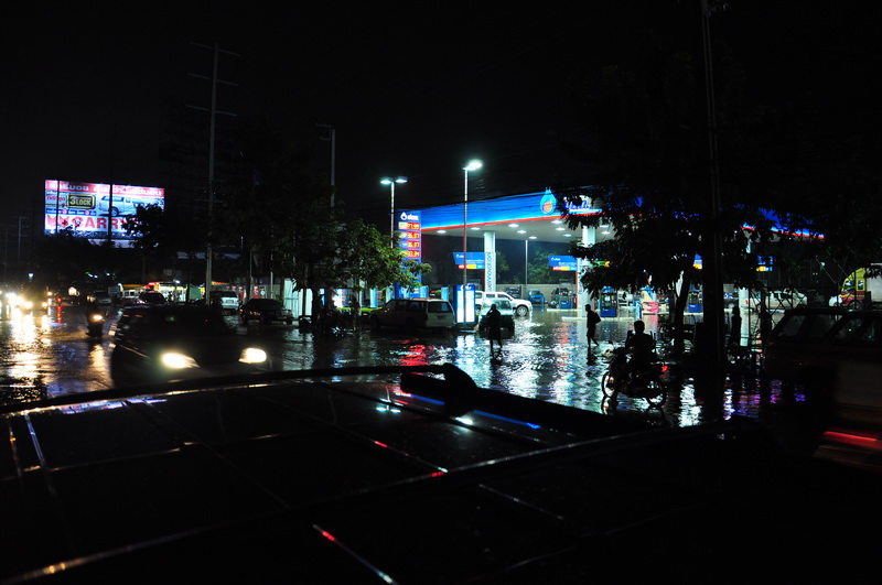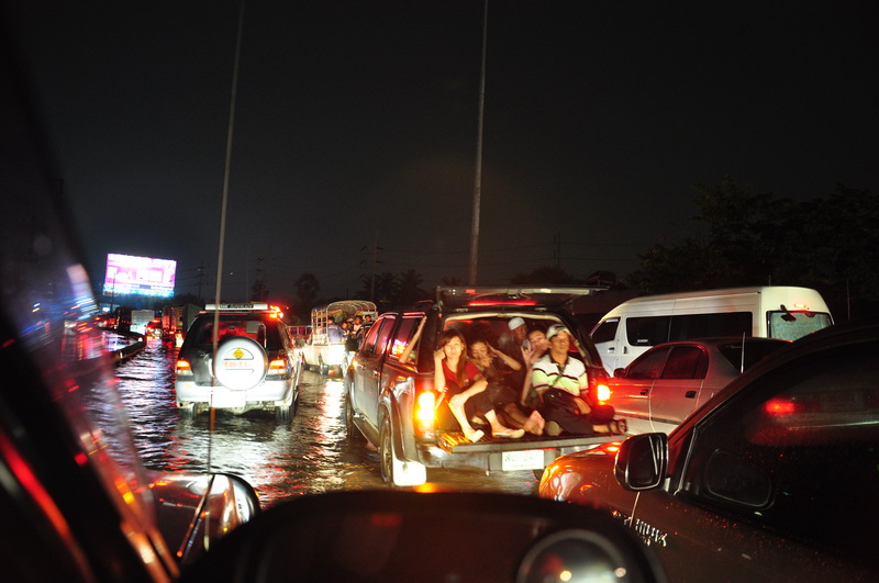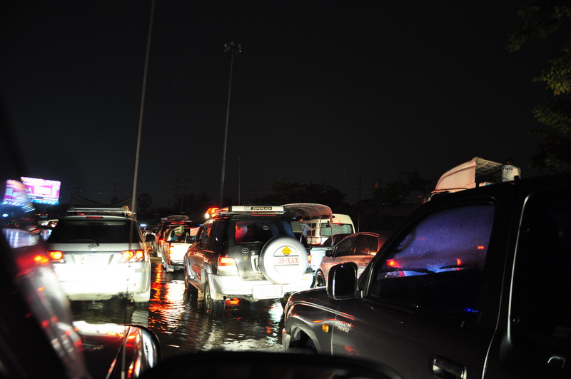 ช่วงหัวค่ำบนถนนกาจนาภิเษก ด้านหลังสะพานข้ามไปถนนรัตนาธิเบต รถจอดหนีน้ำแล้ว 2 ช่อง การจราจรใช้ได้แค่ 1 ช่อง สุดยอดดดดดด .. ดการจัดการ