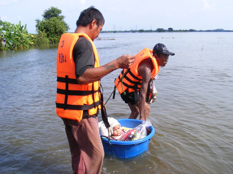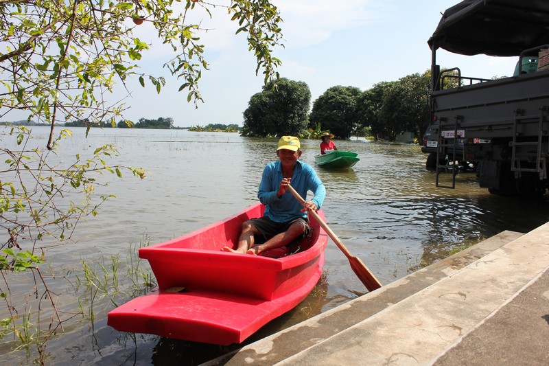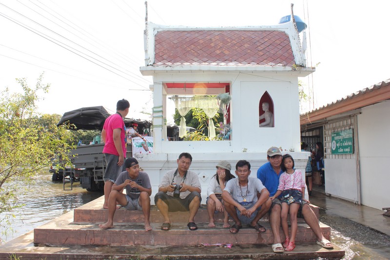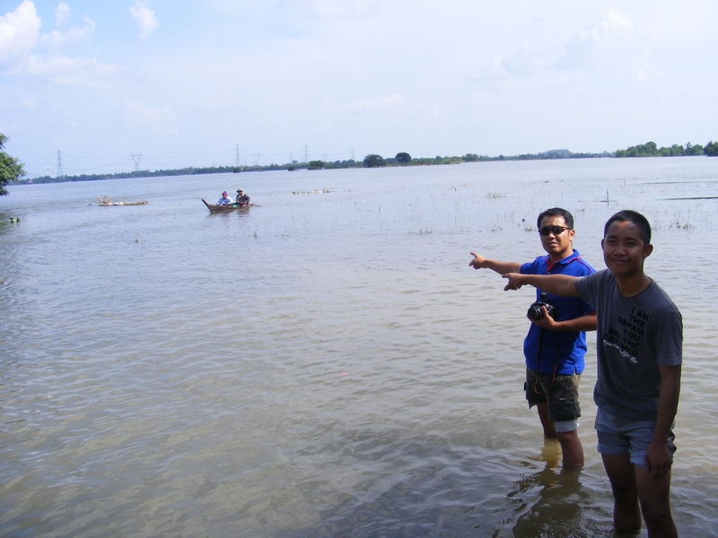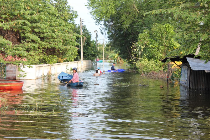 พี่จารุ กะน้องแสบ ชี้ให้เห็นว่าชาวบ้านพายเรือมาจากบ้านที่อยู่กลางทุ่งไกลๆ โน้น ที่เห็นเป็นท้องน้ำกว้างใหญ่นั้นคือทุ่งนาที่ถูกน้ำท่วมทั้งหมด
