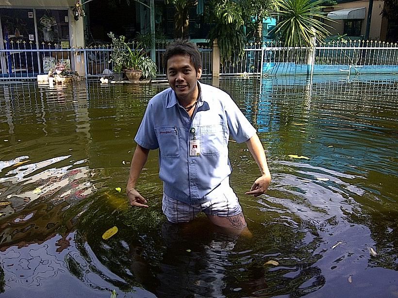 แต่น้ำยังท่วมในซอยอยู่เลย เดินออกไปไม่ได้ เพราะงั้น เก็บรถไว้ก่อน