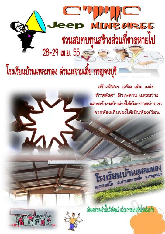 28-29 เมษายน 2555 นี้ ชวนบรรดาเหล่าสมาชิกมีนบุรี และทุกๆท่าน ร่วมสมทบทุนสร้างเสริมส่วนที่ขาดหายไป ณ โรงเรียนบ้านแหลมทอง ด่านมะขามเตี้ย กาญจนบุรี