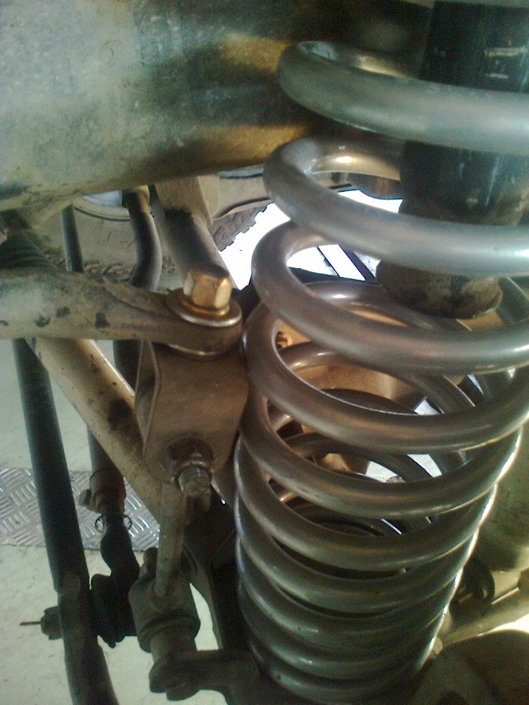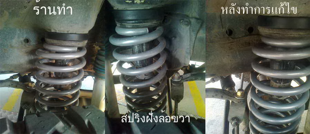 เอาล่ะครับเห็นรูปแล้วผมจะอธิบายเลยเนื่องจากหน้าผมมันหนักเพราะมีกันชนกะวิ๊นก็เลยรองก้อนไปอีกหน่อย ผลที่ได้ก็น่าพอใจหน้าเชิดขึ้นมานิด แต่ๆๆๆหลังจากใส่ก้อนใส่สปริงแล้วกันโคลงฝั่งซ้ายมันไปมุดกับสปริงซึ่งด้านขวาปกติ ช่างบอกต้องเปลี่ยนกันโคลงให้ยาว ลูกน้องเสริมมาอีกเห็นมั้ยกันโคลงมันต้องเสมอแชชซีเปลี่ยนแล้วหายเลย แต่ตาสองคู่ของผมมันเห็นว่าสปริงไม่เข้าเบ้า โค้งแบบนั้นยังงัยมันต้องชนกับกันโคลงแน่ๆ ผมพยามยามเรียกให้ช่างมาดูแต่ก็ไม่อยากพูดมากเดี๋ยวจะหาว่ารู้เกินจ่า ก็จ่ายตังค่าทำแล้วก็ถอยแบบกะเผลกๆออกมาแบบเจ็บๆ ไปทำร้านอื่นก็ได้ จบตามรูปที่สาม งัดสปริงให้ลงเบ้าเป็นอันจบไม่ต้องเปลี่ยนกันโคลงห้าหกพันบ้าบอไรด้วย ร้านไหนหลังไมค์ละกันครับอย่าให้เจ็บไปมากกว่านี้