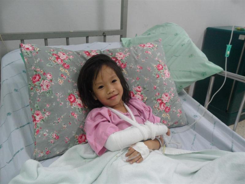 ตัวเล็กเกิดอุบัติเหตุวิ่งๆอยู่แล้วหกล้มกระดูกแขนงอ ต้องเข้าโรงพยาบาลเพื่อดัดแขนให้กลับมาให้ตรงเหมือนเดิม เพิ่งกลับบ้านบ่ายๆวันนี้