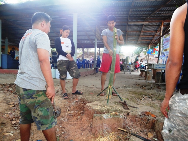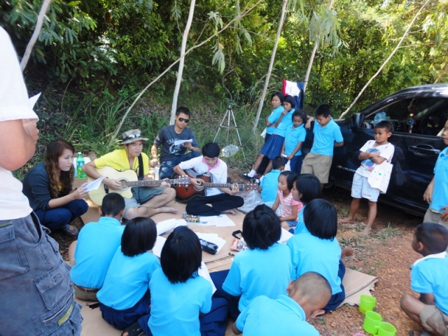 น้องๆ ส่วนหนึ่ง แอบไปซุ่มซ้อมการละเล่น ที่จะนำเสนอแก่ พี่ๆ กลุ่มเส้นทางบุญ ที่มาสร้างสรรพัฒนา โรงเรียนของเขา