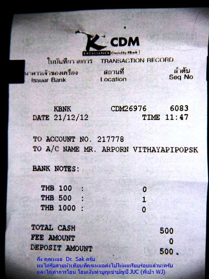 21/12/2012 ฝากโดยเงินสดโดยไม่มีสมุดคู่ฝาก 500 35,739.42 เปลี่ยนรหัสสาขาผู้ลงบัญชี 26976
