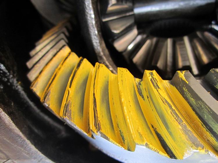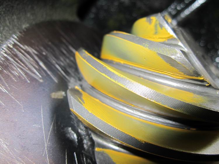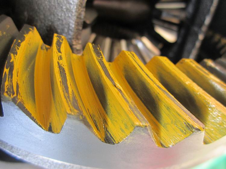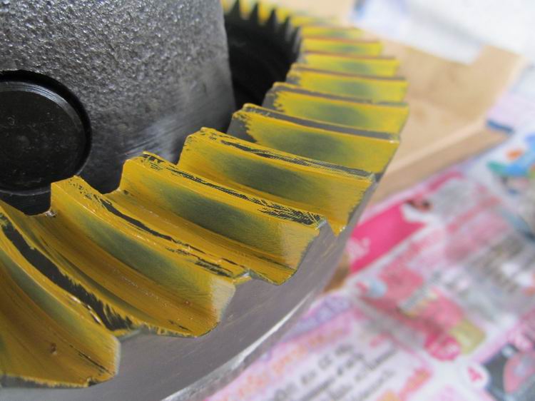 สำหรับบิดเฟืองบายศรีให้หมุนในทิศทางเดินหน้าและถอยหลัง...หากเราทดสอบด้วยสีเสน ซึ่งสีที่ใช้ต้องมีความละเอียดของสีมากพอสมควร จะแสดงการชบของเฟืองได้ละเอียดมากขึ้น บางครั้งเราดูสีที่เฟืองบายศรี นาน ๆ ตาจะลาย อาจจะแยกแนวชบของเฟืองได้ไม่ชัดเจน ผมเลยใช้วิธี บางดูที่เฟืองเดือยหมูแทน ว่าสีที่สัมผัสมีความเสมอเท่ากันไหม หากเสมอเท่ากันเป็นแนว แสดงว่าเฟืองนั้นไม่หอน...