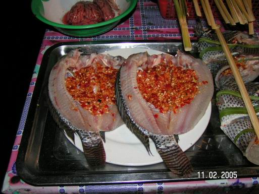 ตลาดอาหารในเมืองลา ยามค่ำคืน เมนูที่เห็นในภาพนั้นก็คือ ปลา 3 รส ดูแล้วน่าทานนะครับ