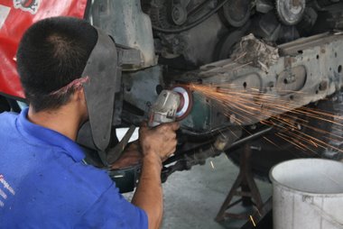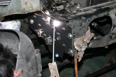 หลังจากนั้นก็เชื่อมหัวบู๊ชด้านในและเชื่อมหยอดรูแผ่นดามกระปุกให้หมด สังเกตุฝีมือการเชื่อมของช่าง สงสัยทำงานตั้งแต่เช้าจนค่ำเริ่มเพลีย เลยใช้เท้าเชื่อม แต่ไม่เป็นไรเราต้องการความเเข็งแรงความสวยงามค่อยมาเก็บเจียรทีหลัง การตั้งไฟเชื่อมอย่าตั้งแรงมากเพราะจะทำให้เหล็ดบางๆ ของหัวคัสซีรถทะลุได้นะครับ