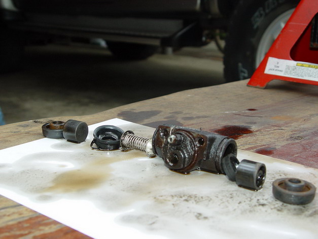 ปกติส่วนใหญ่ผมจะขับ jeep เวลาไปไหนมาไหน ผบ.จะขับวีออส เพราะมันคล่องตัว แต่วันนี้ผมต้องเอาวีออสไปตั้งวาวล์ ก็เลยให้ผบ. ใช้ jeep คิดว่าคงไม่มีอะไร เพราะเมื่อวานนี้พึ่งเช็คเบรคหน้า เปลี่ยนท่อน้ำ เปลี่ยนโช๊คใหม่ พอตั้งวาวล์เสร็จผมก็กลับบ้านวันนี้ฝนตกหนักมากรถติดไปหมด กลับถึงบ้าน ผบ. บอกว่ารถมันแปลกๆ ออกจากบ้านไปสักพักหนึ่งสงสัยเครื่องมันจะแรงขับไปเบรคไม่ค่อยอยู่ ยิ่งขับเบรคยิ่งลึกขึ้นเรื่อยๆ ต้องดึงเบรคมือช่วยตลอด ผมก็แปลกใจ ปกติมันเบรคง่ายจะตาย ก็เลยไปเปิดผากระโปรงดู ตกใจหมด มันไม่มีน้ำมันเบรคเหลืออยู่เลย ไล่ส่องไฟดูตามท่อ ตามล้อ เจอต้นตอเลยครับ ล้อหลังขวา น้ำมันเบรคเลอะเต็มไปหมด หมายความว่าวันนี้ทั้งวัน ผบ. ผมขับรถโดยไม่มีเบรค โอ้ววววววววววว หนังเหนียวขนาดนี้เลย ประกันก็พึ่งหมดไปเมื่ออาทิตย์ที่แล้ว ถ้าไปจิ้มตูดใครเข้า ผมกระเป๋าแห้งแน่ครับ 3 ทุ่มกว่าโทรปรึกษาพี่ไข่ดาว ขอบคุณครับสำหรับคำแนะนำที่มีให้เสมอๆ (ตอนดึกอีกต่างหาก) น่าจะเป็นที่กระบอกสูบแตก หรือ ลูกยางรั่ว ไม่รู้เรียกถูกมั้ยครับ เป็น โฉมมลปี 2000 สรุปแล้วจอดทิ้งไว้ที่บ้านก่อนครับ เช้าค่อยถอดล้อมาดู ระวังกันหน่อยนะครับ ดีนะครับที่ผบ. ผมยังโชคดีอยู่