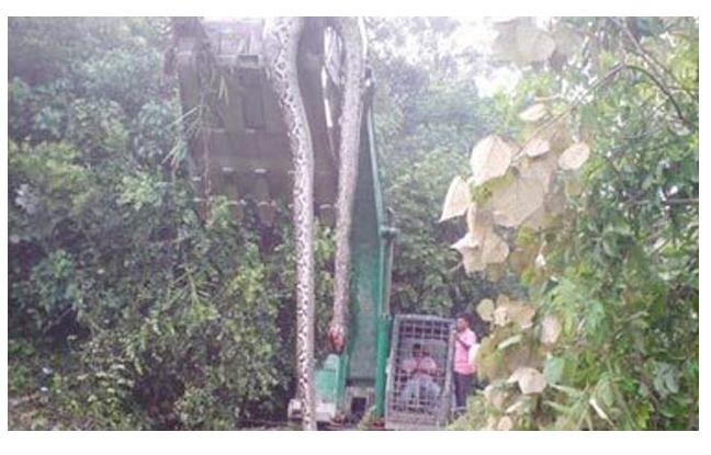 แต่การขุดยังดำเนินต่อไป กระทั่งพบงูขนาดมหึมา วัดความยาวได้ราว 16.7 เมตร หนักกว่า 300 กิโลกรัม และคาดว่ามีอายุมากถึง 140 ปี อยู่ในสภาพอ่อนแรง คาดว่าเป็นเพราะการขุดดินอาจส่งผลให้งูยักษ์ได้รับบาดเจ็บ ทั้งนี้คนงานกล่าวว่า นอกจากงูยักษ์ตัวดังกล่าวยัง พบงูเหลือม ขนาดใหญ่อีก 1 ตัว บริเวณเดียวกัน เป็นเหตุให้บรรดาคนงานตั้งสติไม่อยู่และวิ่งหนีไปในที่สุด หลังจากรวบรวมสติคืนมาได้ก็ย้อนกลับมายังสถานที่เกิดเหตุ แต่งูเหลือมได้เลื้อยหนีหายเข้าไปในป่าแล้ว เหลือแต่เพียงงูยักษ์ ที่ทนพิษบาดแผลไม่ไหว และตายในที่สุด ภาพของงูยักษ์ตัวดังกล่าวถูกถ่ายภาพเก็บไว้ และเผยแพร่ในหนังสือพิมพ์พีเพิลส์เดลี่ของจีน อีกทั้งถูกโพสลงอินเตอร์เน็ต จนเป็นที่ฮือฮาจากบรรดานักท่องเว็บ