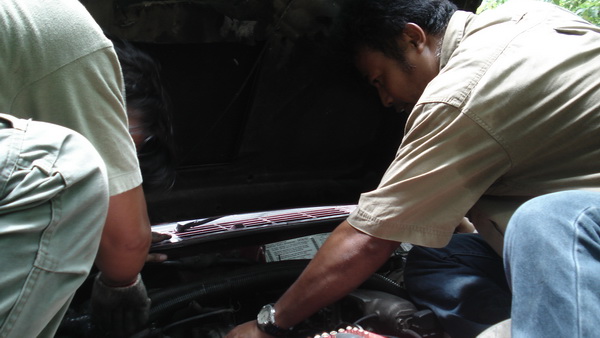 หลังจากเจ้าเลียงผาตั้งหลักได้แล้วเราก็มาดูความเสียหายของเครื่องยนต์โดยน้าต้นมะลิกับน้ามานพเปิดเขาควายออกมาทำความสะอาดนำมันเครื่องที่ไหลมาอู่ด้านบนของสูบ