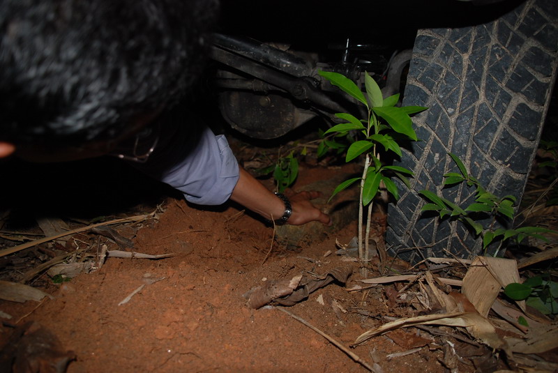 หลังจากสำรวจที่พักเสร็จ ก็เดินทางไปสำรวจเส้นทางออฟโรดที่น้ำตก เส้นทางก็ไม่มีอะไรลำบากมาก แต่ตอนกำลังกลับรถกันด้วยความมืด (ไปกันสองคัน) คันแรกกลับรถเสร็จ คันที่สองทิ่มหัวเข้าไป เสียงดัง ฟี่ๆๆๆ เจอตอเข้าแล้ว