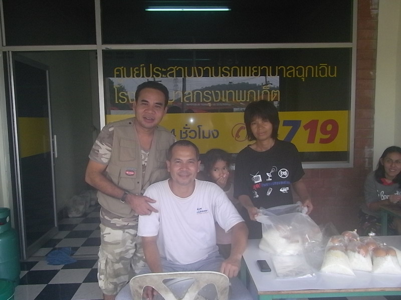 ภารกิจแรกได้เข้าไปเอาข้าวห่อในเมืองแจกชาวบ้านในพื้นที่น้ำท่วม