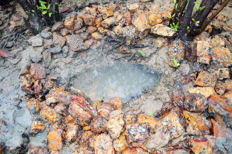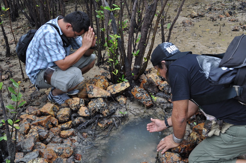 เอากะลามะพร้าวครอบกิ่งต้นโกงกาง เพื่อเป็นการยืนยันตำแหน่งว่าบ่อน้ำจืดอยู่ตรงใต้กะลาที่เรามาพิสูจน์ตอนน้ำลงของอีกวัน แต่ตอนกลับเราเอากะลาครอบกิ่งไม้ไว้เป็นการยืนยันตำแหน่งของบ่อน้ำจืดที่อยู่ในทะเลจริงๆจ้า....