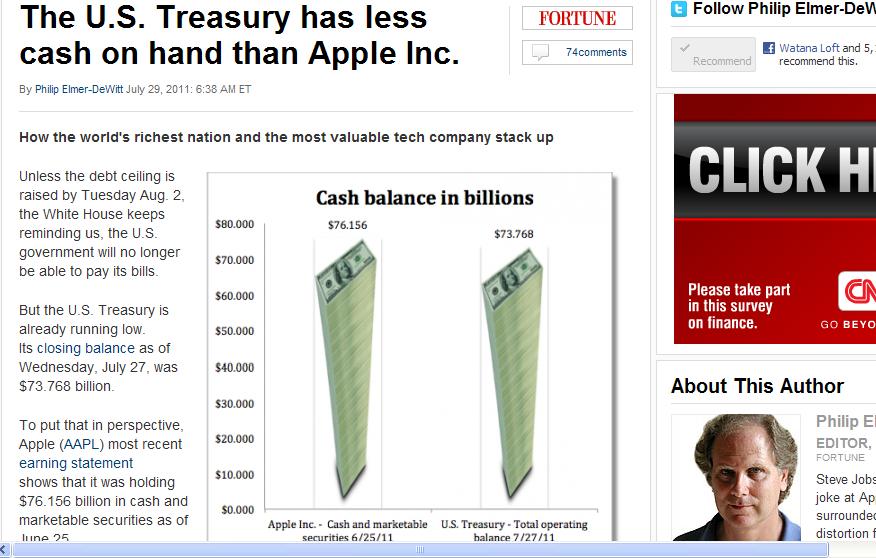 To put that in perspective, Apple (AAPL) most recent earning statement shows that it was holding $76.156 billion in cash and marketable securities as of June 25.