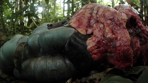 บนความอุดมสมบูรณ์และสวยงามของธรรมชาติ พืชพรรณและสัตว์ป่าอยู่กันอย่างเป็นระบบมีการเกื้อกูล และควบคุมซึ่งกันและกันในระบบของธรรมชาติ..แต่นี่คือร่องรอยของผู้ล่าที่มาจากพื้นราบและอยู่นอกกฏของระบบธรรมชาติ เป็นเครื่องในของเลียงผาตัวหนึ่งสดๆร้อนๆเลือดยังหยดอยู่ ที่ทราบเป็นเลียงผาเพราะมีเท้าและเนื้อส่วนโครงจำนวนหนึ่งที่ถูกทิ้งไว้ ..เราอยู่กันแต่ในเมืองเรามีเวลาเที่ยวกันแค่ขอบชายป่า แท้จริงแล้วลึกๆเข้าไปในป่ามีเรื่องราวมากมายเกิดขึ้นกับสัตว์ป่าเหล่านี้ทุกวัน