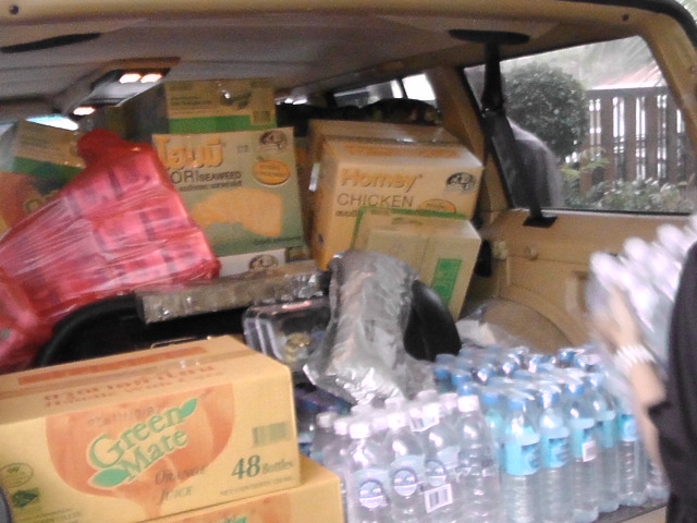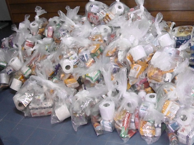 6.พ่อแฮ้งค์และเพื่อน บริจาคขนมปังโฮมมี่ 800 ห่อ,น้ำผลไม้กรีนเมท 240 กระป๋อง,มาม่า 150 ซอง ผ้าอนามัย 30 ห่อ,กระดาษทิชชู 36 ม้วน,น้ำดื่ม 4 แพ็ค,ยาทากันยุง 48 ,โอวันติน 48 กล่อง,ถุงดำ 4 แพ็ค พาราเตามอล 1 กล่อง,ยาทาแก้คันคาลาไมน์ 24 ขวด