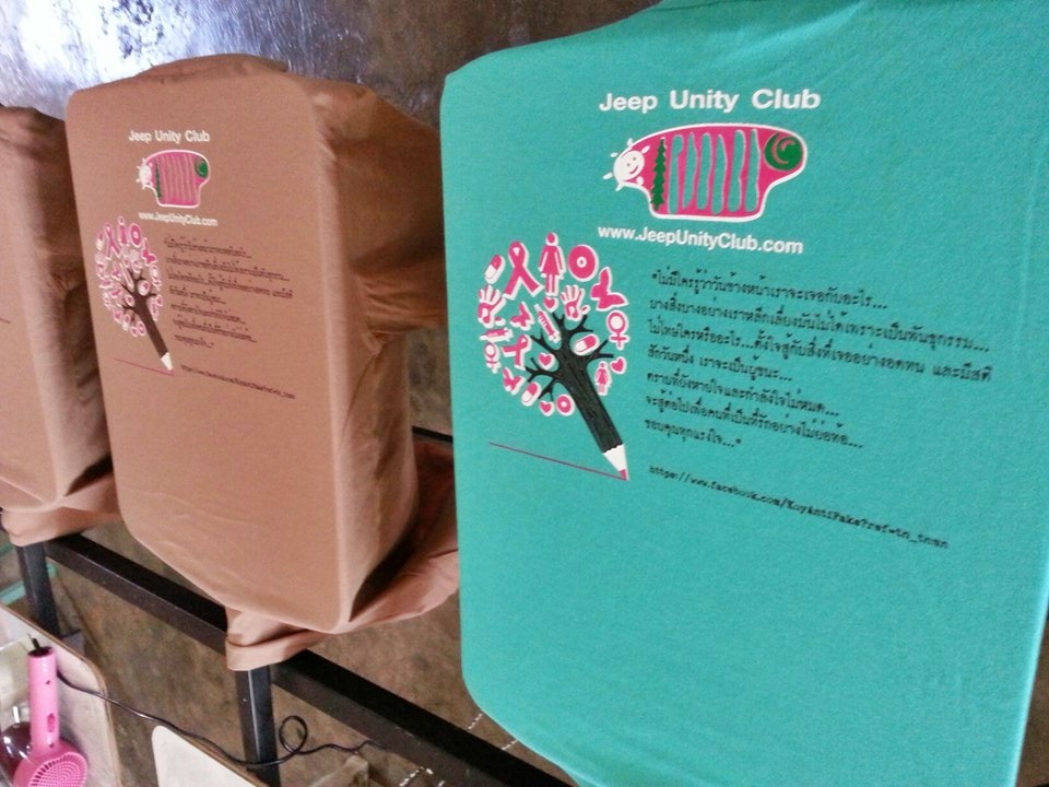 ผม The-may ( JUC 373 ) กลุ่ม Jeep ซุ้ม - สุม - หัว ตะวันออก ขอคำแนะนำเรื่องการจำหน่ายเสื้อในกระทู้เนื่องจากภรรยาผม สมาชิก JUC 2741( แม่น้องโฟร์ฯ ) ได้ป่วยเป็นโรคมะเร็งเต้านม โดยทราบผลปลายเดือนมีนาคมที่ผ่านมา เริ่มต้นรักษาด้วยการตัดเต้านมข้างซ้ายออกแล้ว และต่อด้วยการให้เคมีบำบัด ( คีโม ) อีก 6 ครั้ง กินยาต้านฮอร์โมนต่อเนื้องอีก 5 ปีซึ่งค่าใช้จ่ายค่อนข้างสูง เพื่อน เพื่อน ใน JUC หลายท่านได้แนะนำและสนับสนุนให้จัดทำเสื้อขึ้นมาเพื่อจำหน่ายสมทบทุนในค่ารักษาที่ยังมีอยู่ต่อเนื่อง โดยได้จัดทำและจำหน่ายมาซักระยะหนึ่งแล้วในกลุ่มเพื่อนที่รู้จักและที่ทำงาน จนมีโอกาสได้พูดคุยกับกลุ่ม Jeep ลั้นล้า ว่าถ้านำมาลงในเวปบอร์ดจะดูเหมาะสมหรือเปล่า จึงเป็นที่มาของ mail ที่ส่งถึงพี่นินจา เพื่อพิจารณาถึงความเหมาะสมในการเปิดกระทู้จำหน่ายเสื้อ