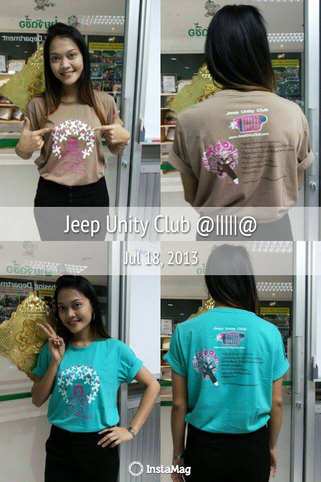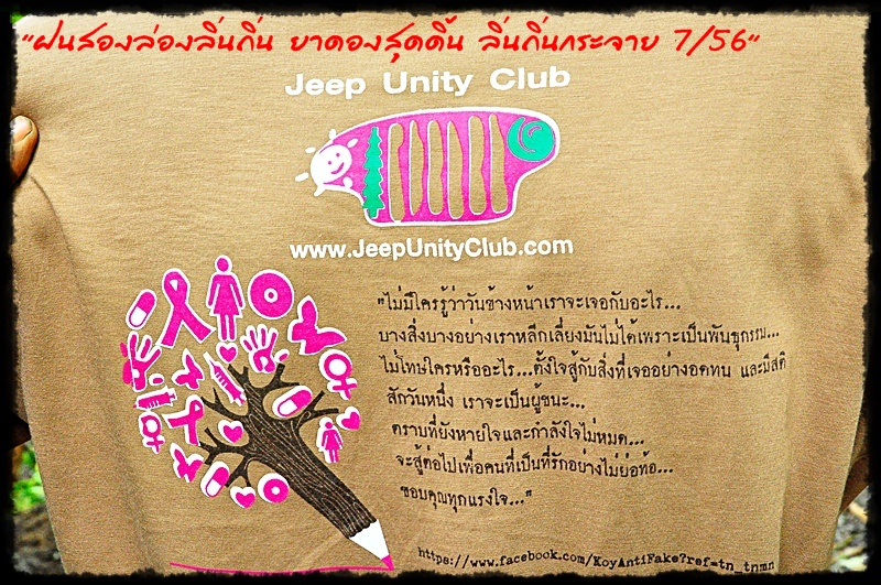 ผม The-may ( JUC 373 ) กลุ่ม Jeep ซุ้ม - สุม - หัว ตะวันออก ขอคำแนะนำเรื่องการจำหน่ายเสื้อในกระทู้เนื่องจากภรรยาผม สมาชิก JUC 2741( แม่น้องโฟร์ฯ ) ได้ป่วยเป็นโรคมะเร็งเต้านม โดยทราบผลปลายเดือนมีนาคมที่ผ่านมา เริ่มต้นรักษาด้วยการตัดเต้านมข้างซ้ายออกแล้ว และต่อด้วยการให้เคมีบำบัด ( คีโม ) อีก 6 ครั้ง กินยาต้านฮอร์โมนต่อเนื้องอีก 5 ปีซึ่งค่าใช้จ่ายค่อนข้างสูง เพื่อน เพื่อน ใน JUC หลายท่านได้แนะนำและสนับสนุนให้จัดทำเสื้อขึ้นมาเพื่อจำหน่ายสมทบทุนในค่ารักษาที่ยังมีอยู่ต่อเนื่อง โดยได้จัดทำและจำหน่ายมาซักระยะหนึ่งแล้วในกลุ่มเพื่อนที่รู้จักและที่ทำงาน จนมีโอกาสได้พูดคุยกับกลุ่ม Jeep ลั้นล้า ว่าถ้านำมาลงในเวปบอร์ดจะดูเหมาะสมหรือเปล่า จึงเป็นที่มาของ mail ที่ส่งถึงพี่นินจา เพื่อพิจารณาถึงความเหมาะสมในการเปิดกระทู้จำหน่ายเสื้อ