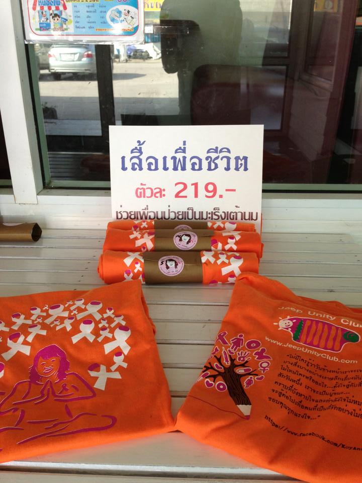 "เสื้อเพื่อชีวิต" เพื่อเป็นทุนต่อสู้กับโรคมะเร็ง ของแม่น้องโฟร์วีลส์ ลูกชายของผม เธอคือคู่ชีวิตนักเดินทาง นั่งคู่กับผม เป็นเพื่อนเดินทางบนรถ Jeep คู่ชีพ คุณกระทิงเฒ่า คันนี้ ไปทุกเส้นทางมา 10 ปีโดยไม่เคยบ่นอยากได้รถคันใหม่เลย ครอบครัวเรารัก Jeep คันนี้มาก ตอนนี้เธอกำลังต่อสู้กับโรคมะเร็งครับ โดยครอบครัวเรากับเพื่อนๆ ช่วยกันทำ เสื้อเพื่อชีวิต ตัวนี้ออกมาจำหน่ายเพื่อหาทุนในการรักษาด้วยตัวเองซึ่งมีค่าใช้จ่ายค่อนข้างสูง เพราะอาการของโรคไม่สามารถรอสวัสดิการของรัฐ หรือรอคิวใดๆ ได้โดยเสื้อดังกล่าวจะเป็นเสื้อยืดผ้า Cotton 100% มี 2 สี คือสีเขียวและสีน้ำตาลอ่อน ใส่แล้วไม่ร้อน ที่คอตัดเย็บดีไม่เหมือนเสื้อยืดทั่วไป แต่ size จะเล็กกว่ามาตรฐานเสื้อยืดในท้องตลาด โดยขนาดรอบอก