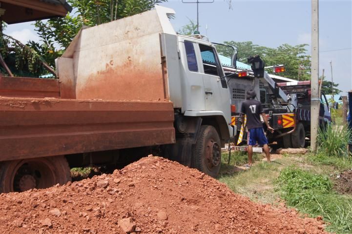 สายๆรถยกเข้ามารอยกอยู่ครับแต่ไม่ขึ้น ต้องขึ้นแม่แรงให้ล้อลอยแล้วเอาหินรองพื้นไปเรื่อยๆจนกว่าล้อจะเกือบเสมอพื้น