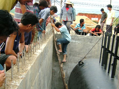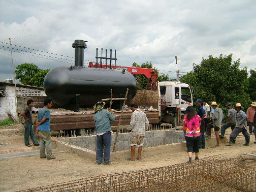 กำลังจัดถังเก็บแก๊สให้ลงตำแหน่งที่ทำไว้